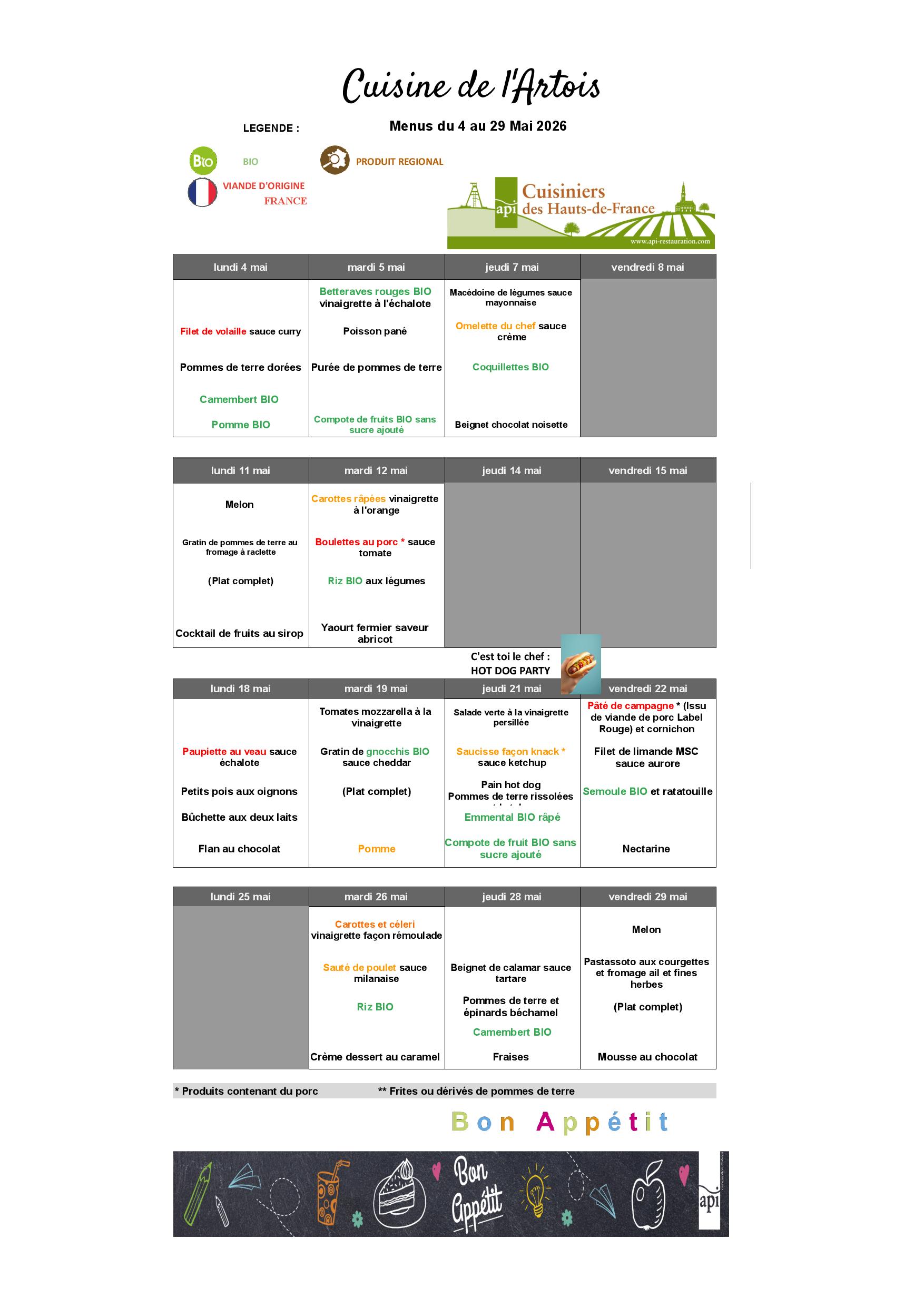- Notre prestataire est API Restauration – Cuisine centrale de Bruay.
